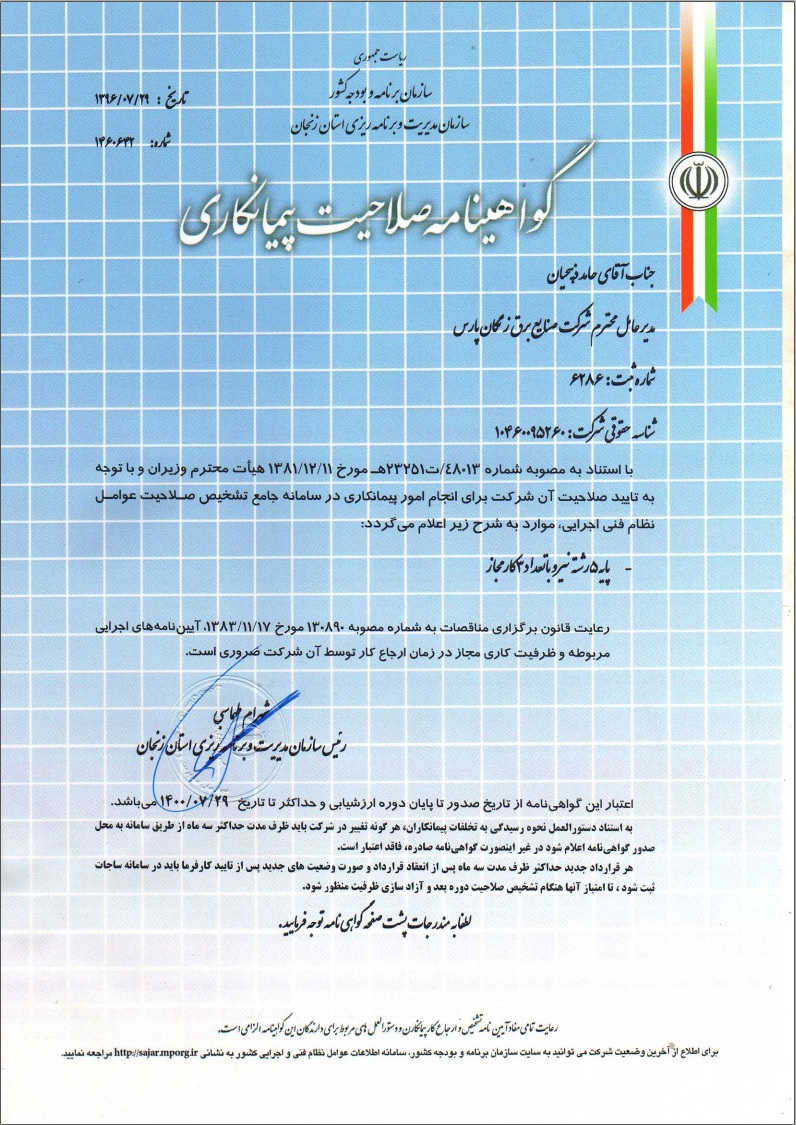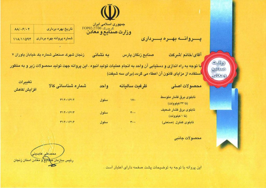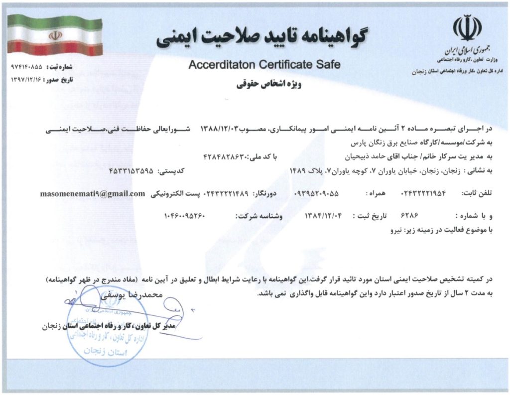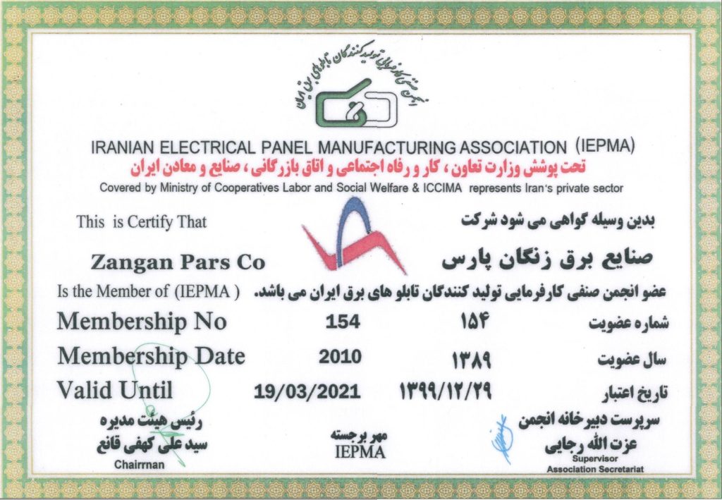 گواهینامه ها زنگان پارس تولیدکننده محصولاتی با کیفیت جهانی گواهینامه های شرکت گواهینامه صلاحیت پیمانکاری از سازمان مدیریت و برنامه ریزی استان زنجان گواهینامه تایپ تست از آزمایشگاه CESI ایتالیا گواهینامه تایپ تست از آزمایشگاه E.P.I.L گواهینامه تایپ تست از آزمایشگاه IPH آلمان گواهینامه استاندارد مدیریت کیفیت ISO9001:2015 گواهینامه صلاحیت ایمنی از اداره تعاون، کار و رفاه اجتماعی استان زنجان گواهینامه عضو انجمن صنفی کارفرمایی تولید کنندگان تابلو برق ایران IEPMA پروانه بهره برداری از وزارت صنایع و معدن