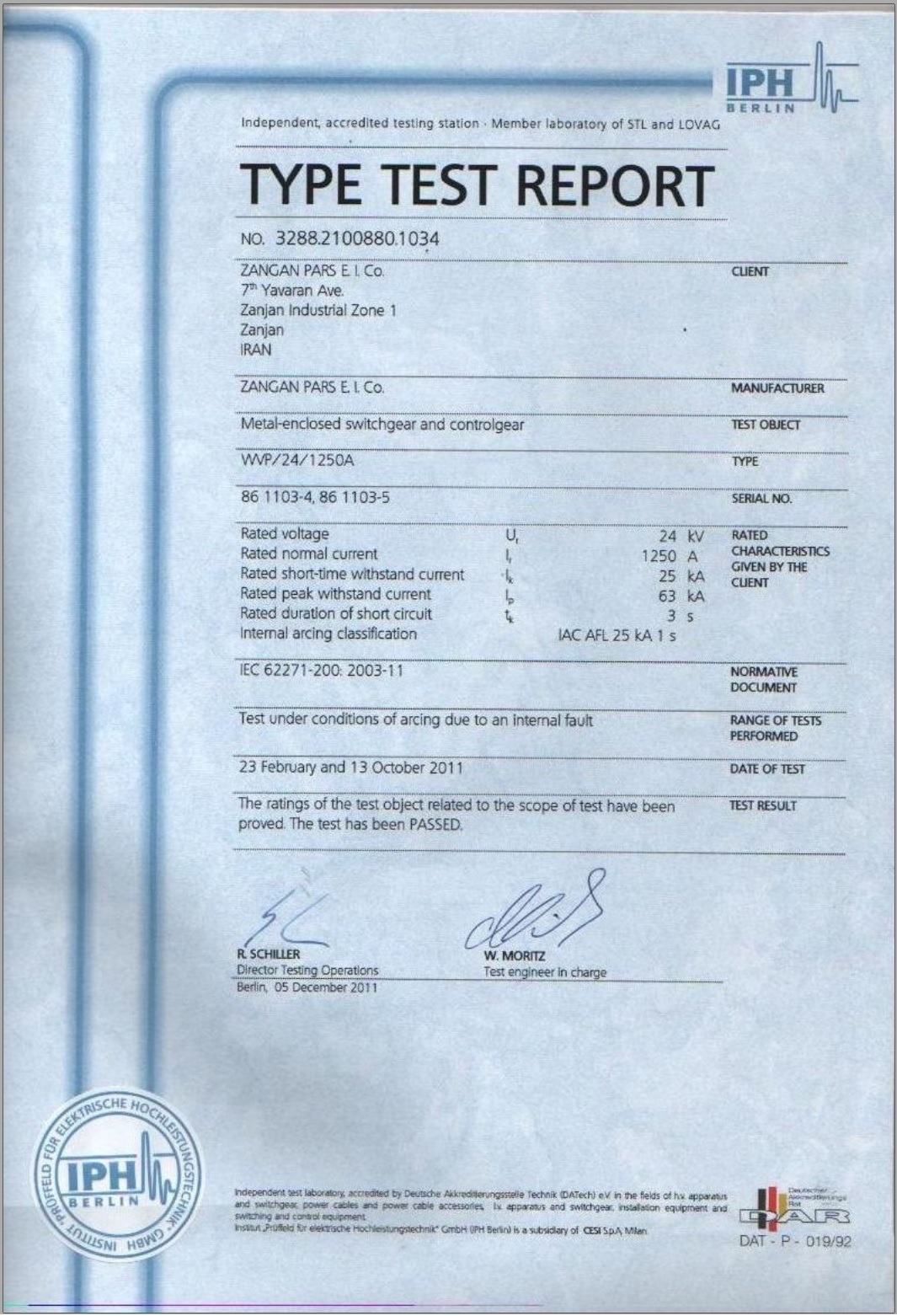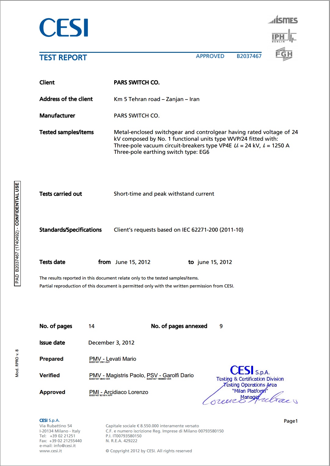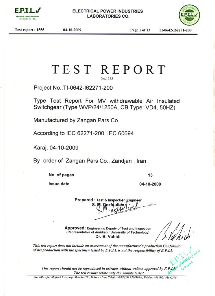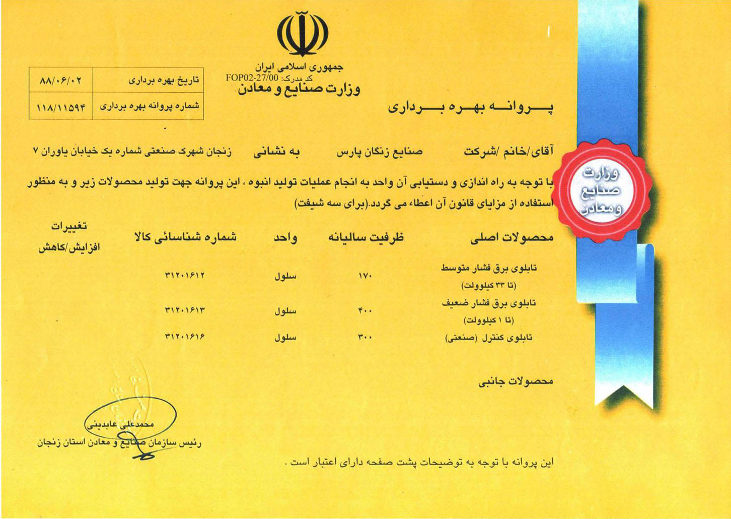 گواهینامه ها زنگان پارس تولیدکننده محصولاتی با کیفیت جهانی گواهینامه های شرکت گواهینامه صلاحیت پیمانکاری از سازمان مدیریت و برنامه ریزی استان زنجان گواهینامه تایپ تست از آزمایشگاه CESI ایتالیا گواهینامه تایپ تست از آزمایشگاه E.P.I.L گواهینامه تایپ تست از آزمایشگاه IPH آلمان گواهینامه استاندارد مدیریت کیفیت ISO9001:2015 گواهینامه صلاحیت ایمنی از اداره تعاون، کار و رفاه اجتماعی استان زنجان گواهینامه عضو انجمن صنفی کارفرمایی تولید کنندگان تابلو برق ایران IEPMA پروانه بهره برداری از وزارت صنایع و معدن